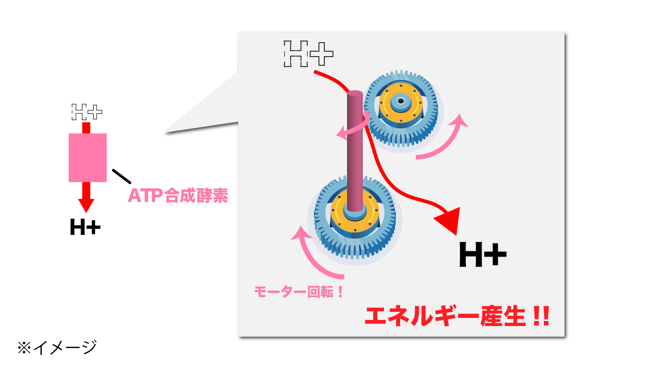 このATP合成酵素を通る際に、エネルギー源であるATPが生み出されます。