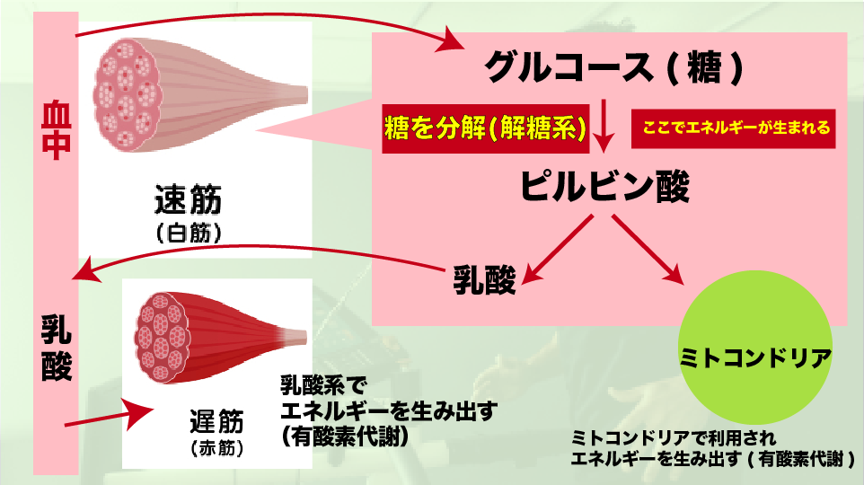 その過程で出た乳酸を酸素を使ってまたエネルギーを産む!(乳酸系)