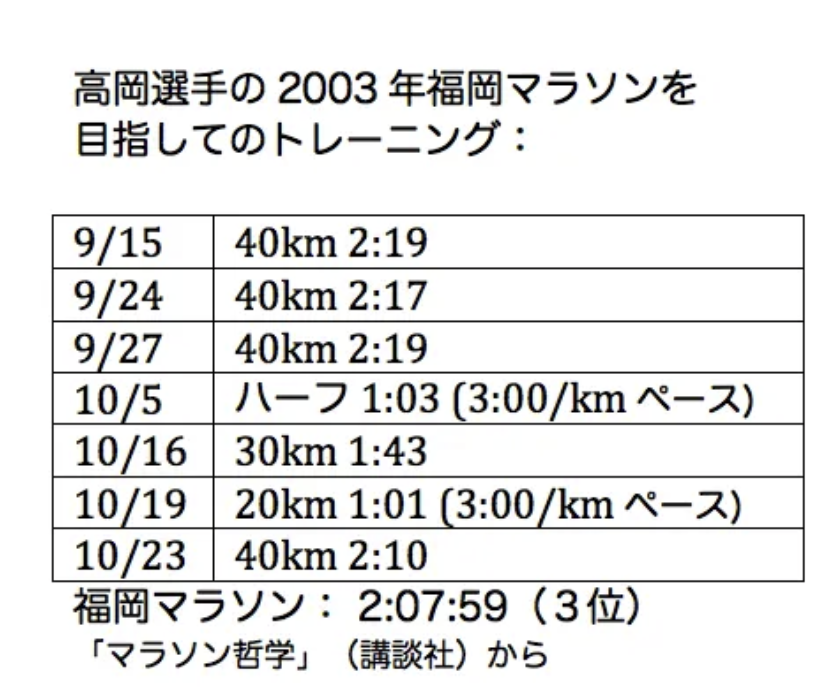 高岡選手の福岡マラソンで2時間7分台で走る前のトレーニングプログラムが有名です。