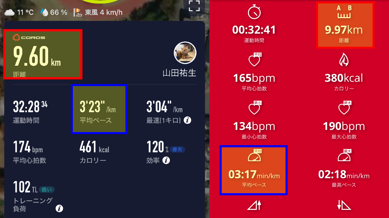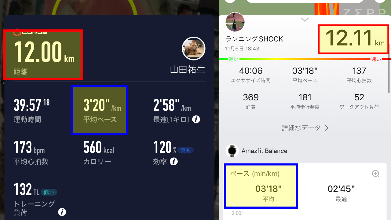 一方、Amazfit はトレーニング距離をほぼ正確に計測してくれています。
