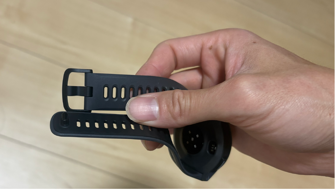 バンド先端の突起物を穴に入れて止める仕様になっています。
