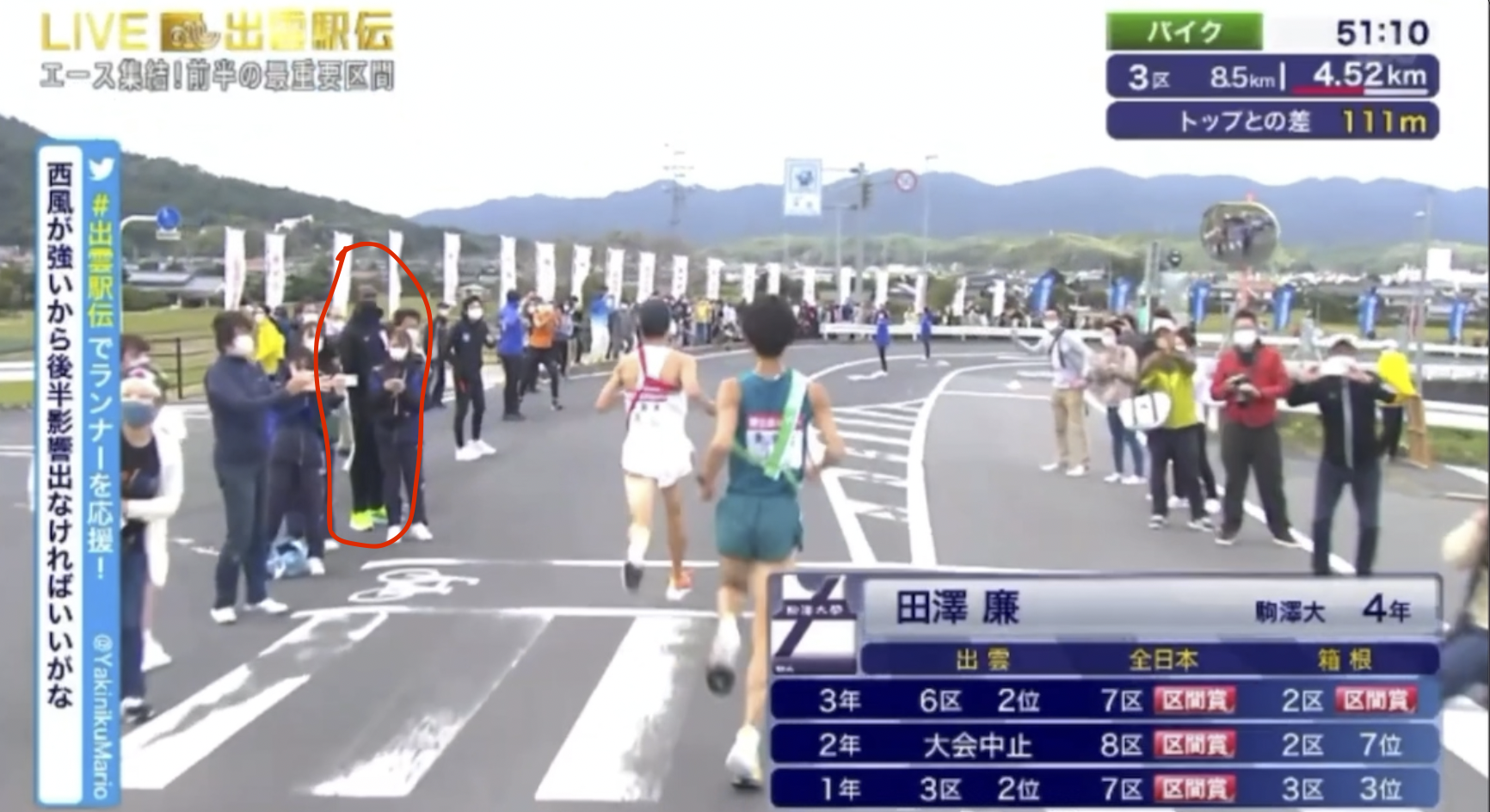 田澤くん橋渡った4.53キロ地点あたりで手挙げてるけど、そこにいたのヴィンセント説ない?!